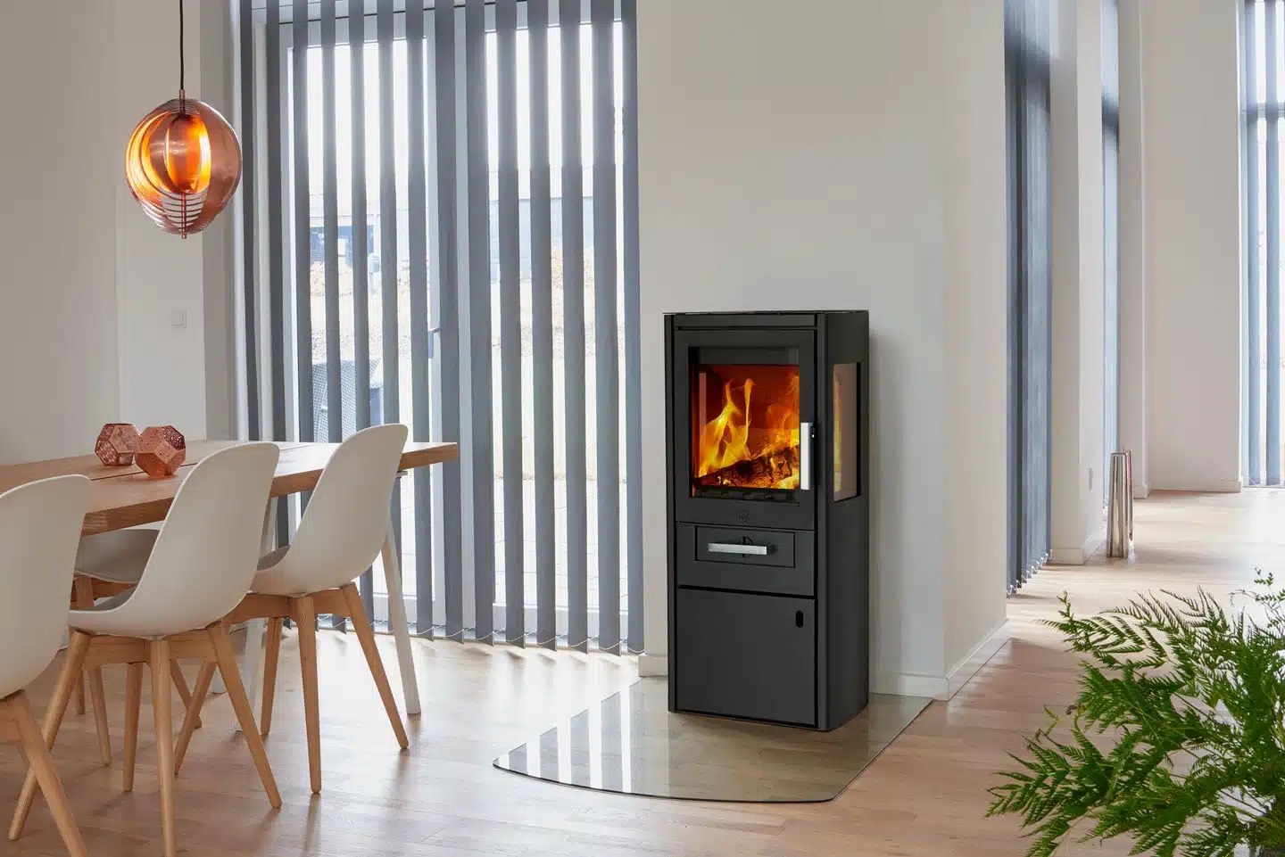 VARDE Bornholm ist ein freistehender Holz‑Kaminofen im skandinavischen Design, der für gemütliche Wärme und eine besonders große Sicht auf das Feuer sorgt.